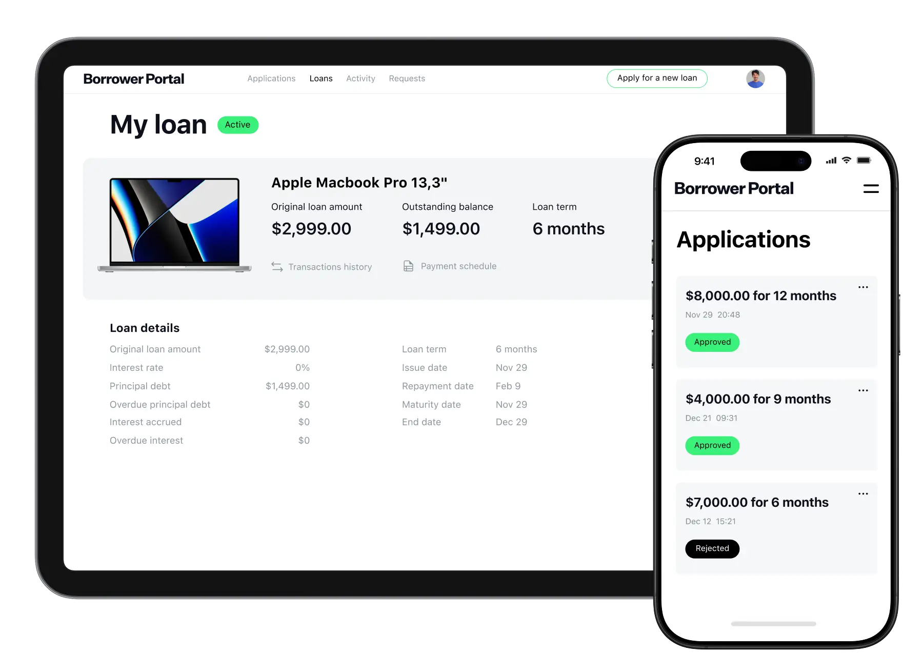 Give borrowers full control over their loans — track payments, view terms, manage