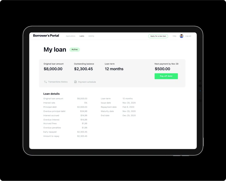 Get easy access to loan attributes and parameters, related transactions, and dynamic amortization schedules—including repayments and interest accruals—all seamlessly managed through our powerful back office.